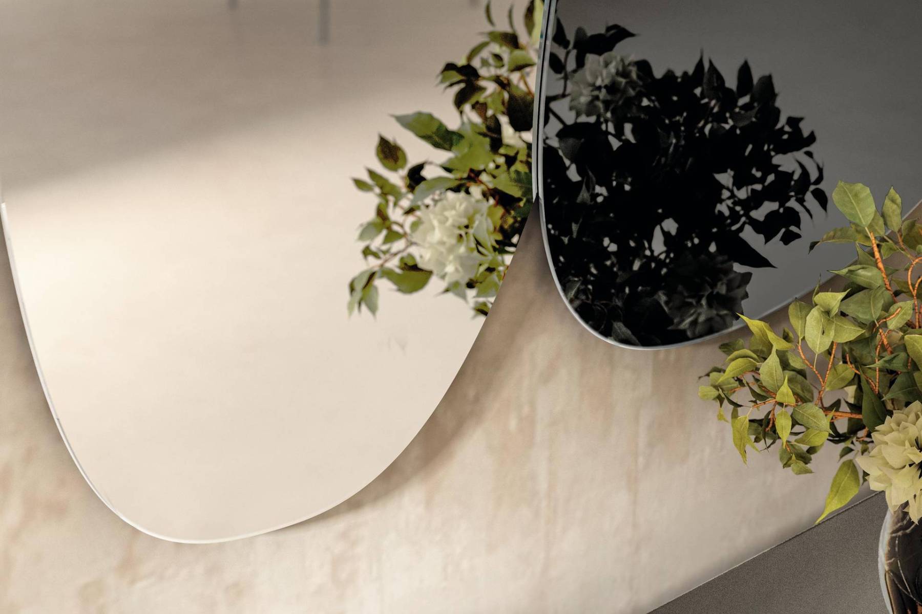 Specchio Pleasure Melty di Lago è la composizione di due sagome dalle linee fluide che si sovrappongono, riflettendo immagini in finiture diverse: specchio naturale, fumé grigio o fumé bronzo.