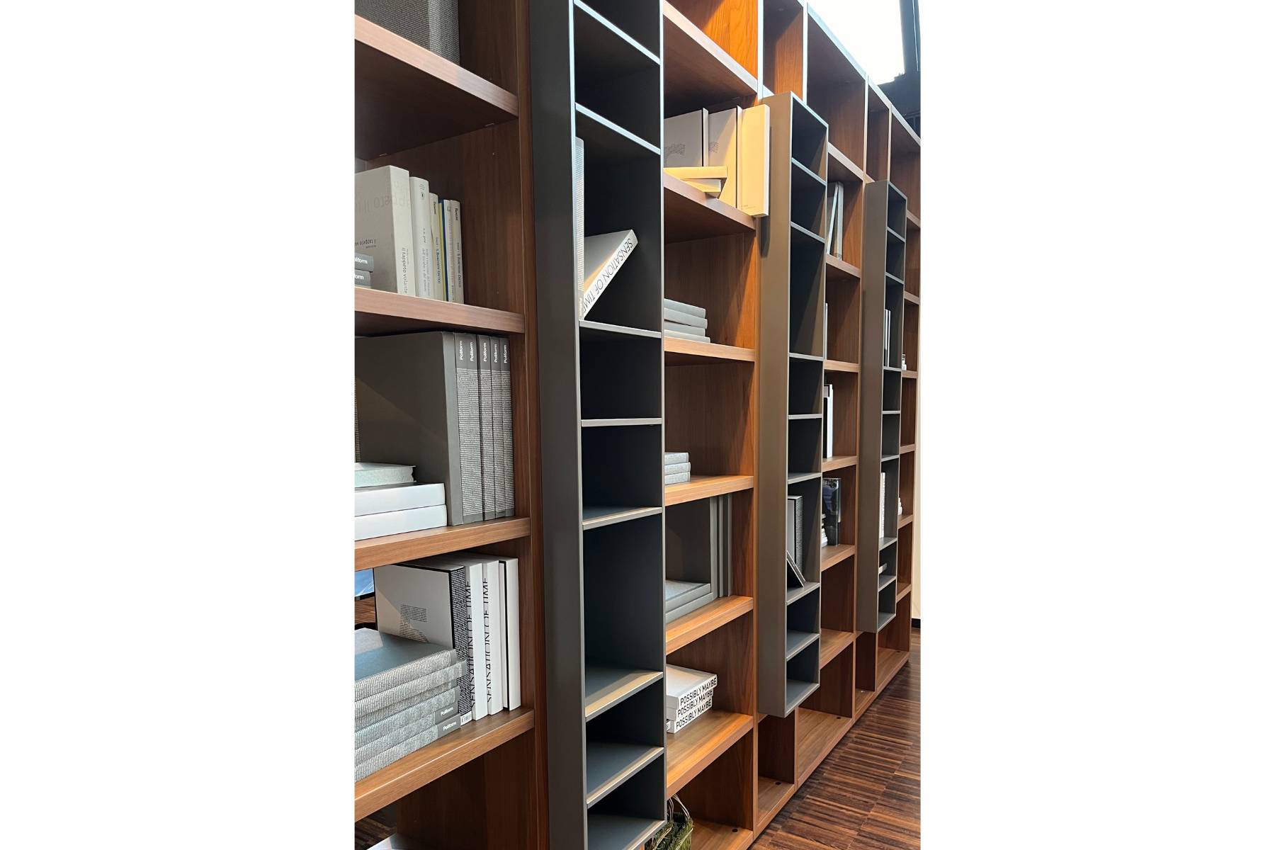 Offre diverse opzioni, tra cui ante battenti, scorrevoli, vetrine, teche, cassetti e portali TV, che ampliano le funzionalità della libreria, consentendo la creazione di spazi come angoli bar o home office. La versatilità si estende anche alle finiture, che contribuiscono a conferire carattere e stile a ogni composizione.