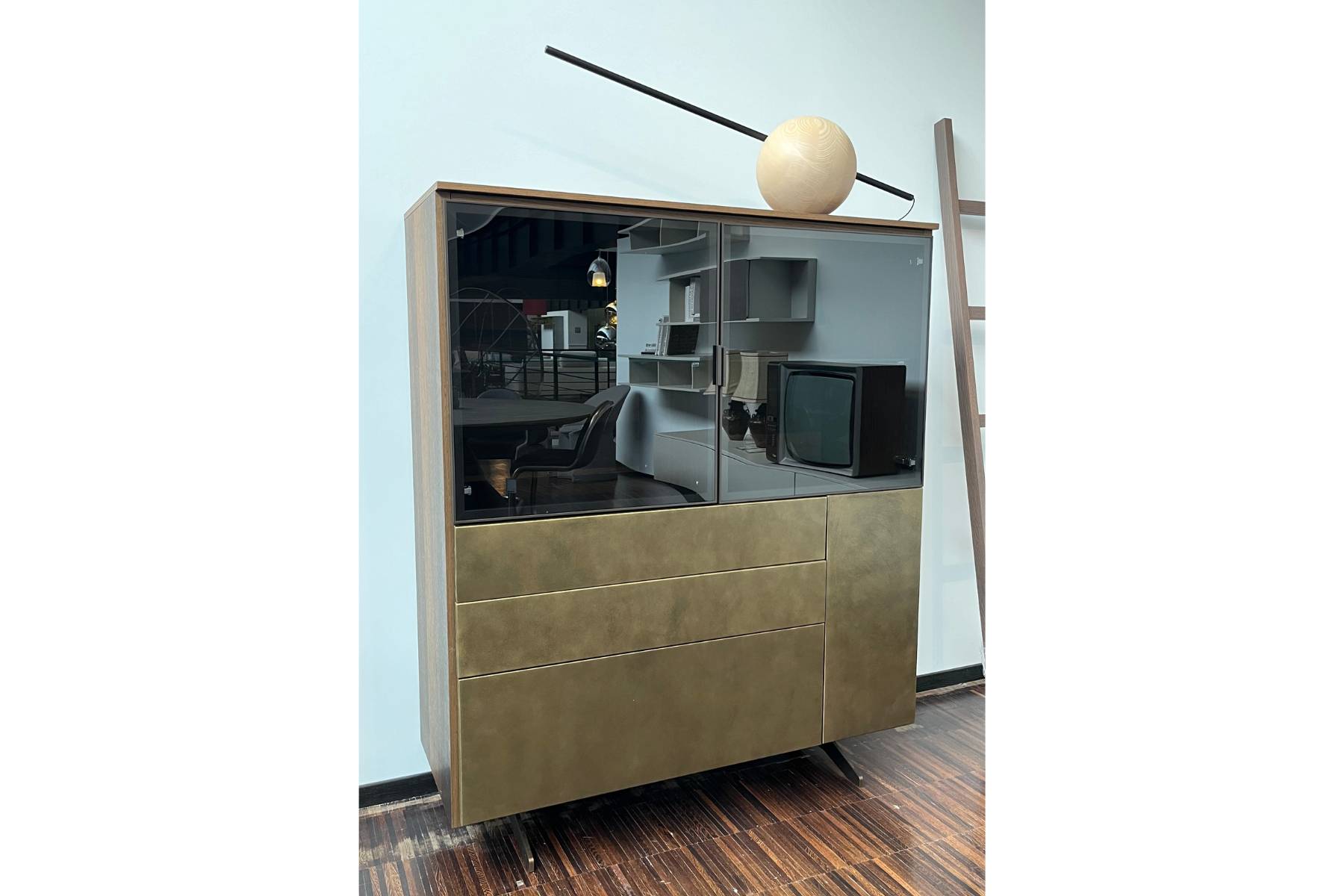 Notebook Plus di Jesse è un mobile o libreria in Rovere Therm e metallo Oro. Le vetrine dispongono di luci interne.