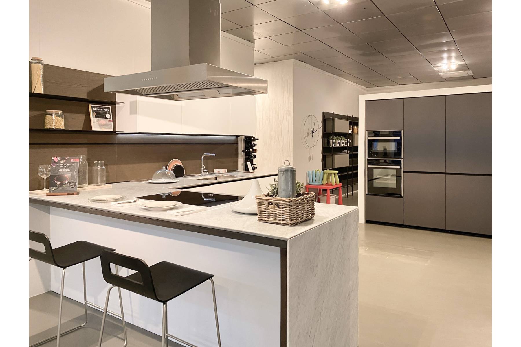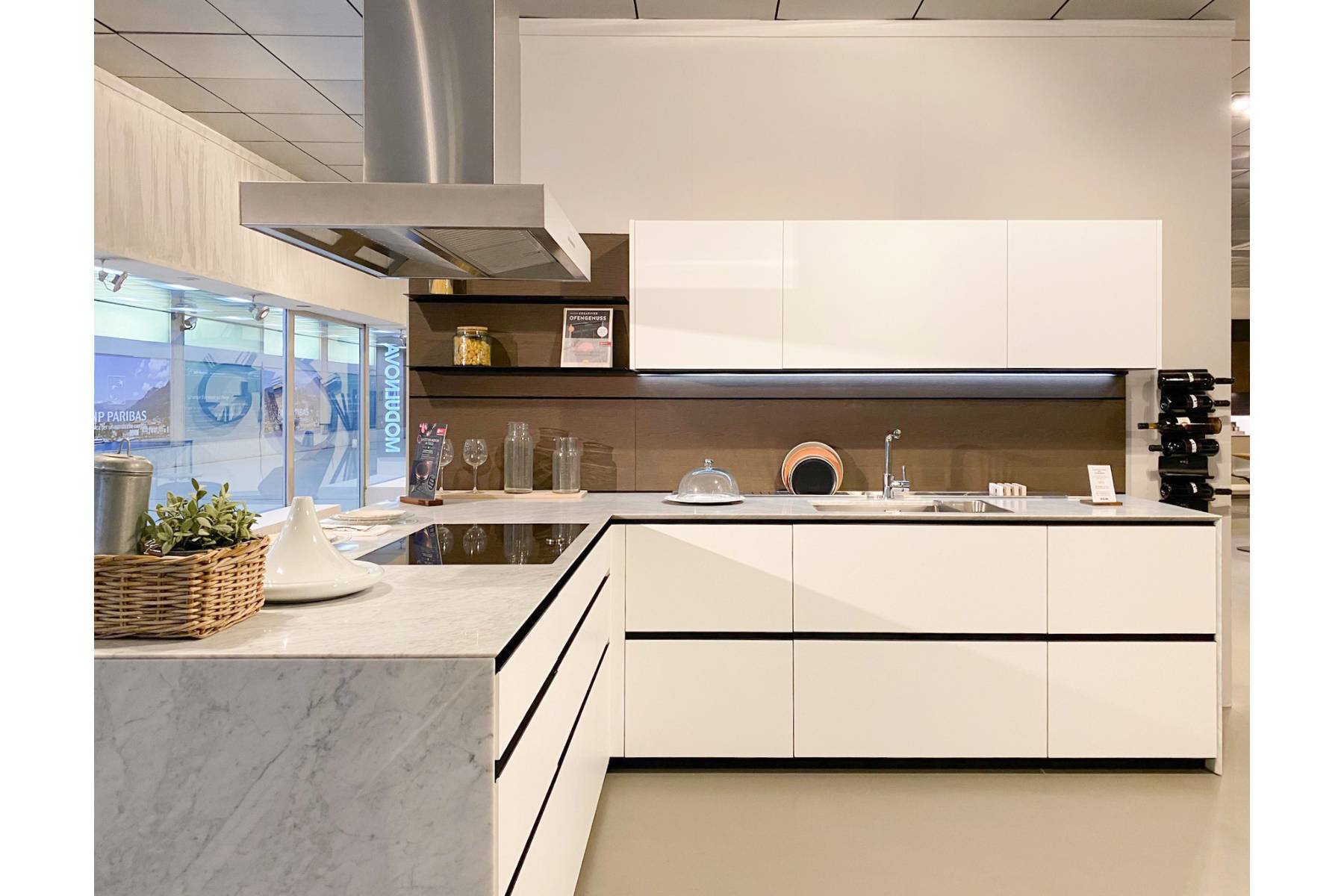 Forma Mentis di Valcucine è una cucina con fusto nobilitato Antracite, anta Angel Skin verniciata colore bianco e le finiture della gola nere.