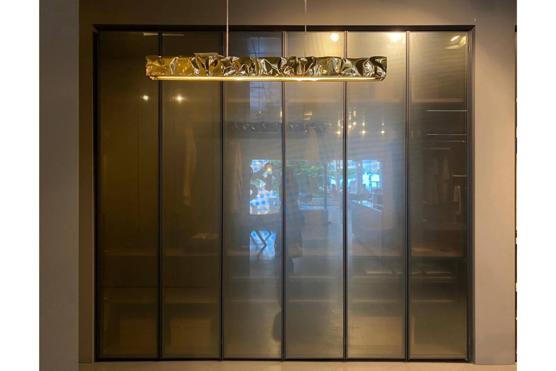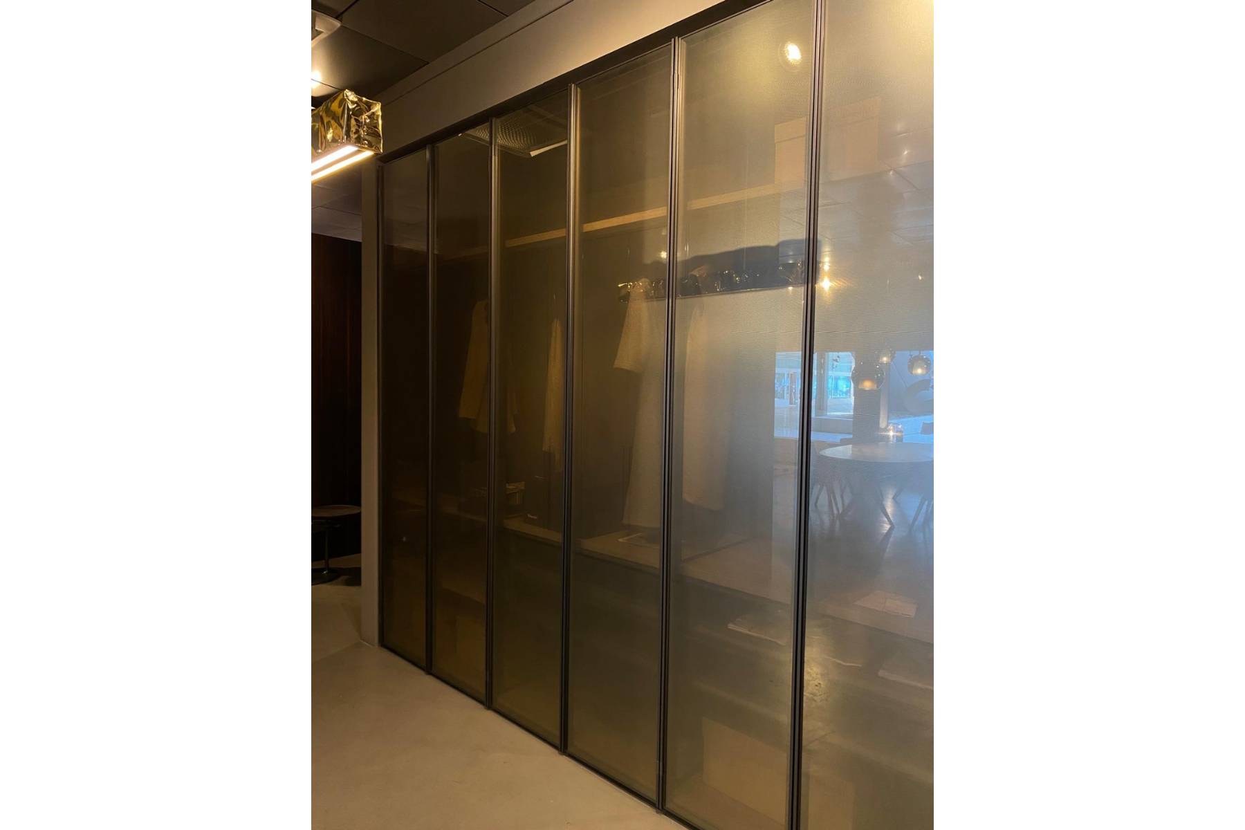 Armadio Gliss Master con ante a stopsol di Molteni&C presenta una struttura in Cembro Argento e il porta abiti in Peltro.