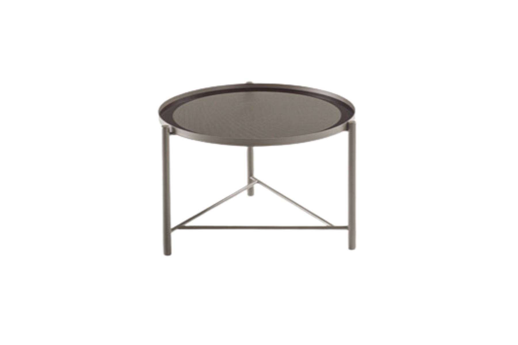Santamonicaย di Frigerio รจ una serie di tavolini caratterizzati da tre gambe esterne in metallo verniciato che sostengono un piano rotondo, disponibile con vetro colorato.